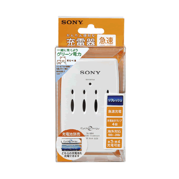 ■ソニー【CycleEnergyサイクルエナジー】ニッケル水素電池専用充電器 BCG-34HRES★SONY【BCG34HRES】価格: 2,500円レビュー評価: 0.0 レビュー数:0 かんたん便利な充電器 リフレッシュ機能付き急速タイプ■単3形、単4形のソニー充電式ニッケル水素電池(Ni-MH)を1-4本まで充電できます■リフレッシュ機能付き■サイクルエナジーグリーン・サイクルエナジーブルーどちらの充電池も充電可能■リフレッシュ表示ランプと4つの個別充電表示ランプ付き■電源プラグ収納式■海外でも使えます。ただし、行先の仕様にあわせたアダプタープラグが必要となります■電圧検知機能■保護タイマー機能■高温度検知機能■入力電源:AC100-240V■出力:DC1.2V■大きさ:幅65×高さ105×奥行30.5mm(電源プラグは除く)■質量:約120g■動作温度:0℃-35℃ |